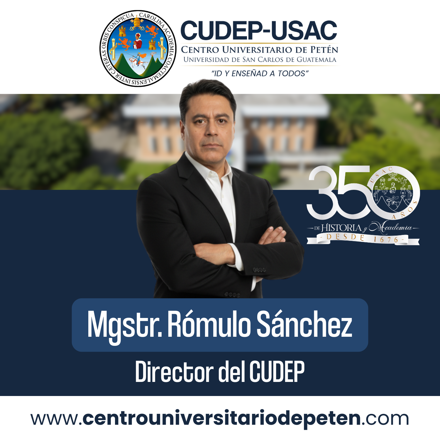 La Dirección del Centro Universitario de Petén está a cargo del Mgstr. Rómulo Sánchez (nombramiento efectuado por el Consejo Directivo en el mes de Enero del año 2026).
