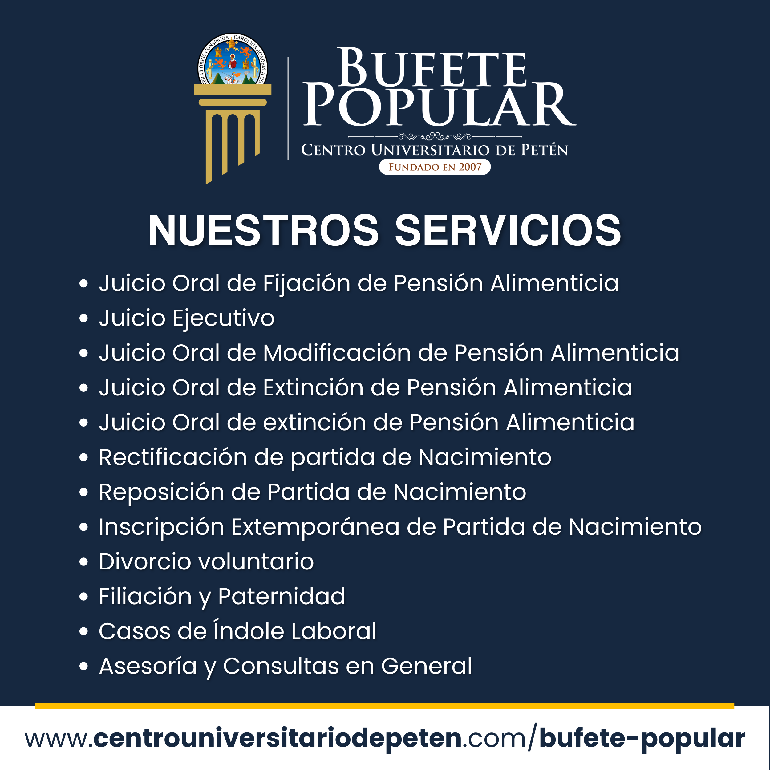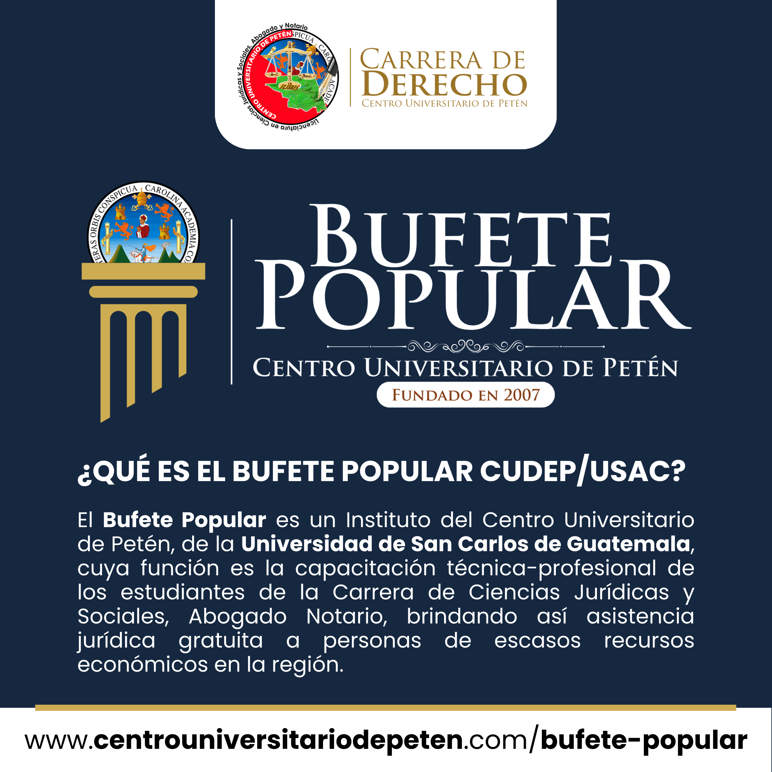 El Bufete Popular de la Universidad de San Carlos de Guatemala (USAC) es un servicio social y académico que brinda asesoría y acompañamiento legal gratuito a personas de escasos recursos económicos que necesitan resolver problemas jurídicos y no pueden pagar a un abogado particular.