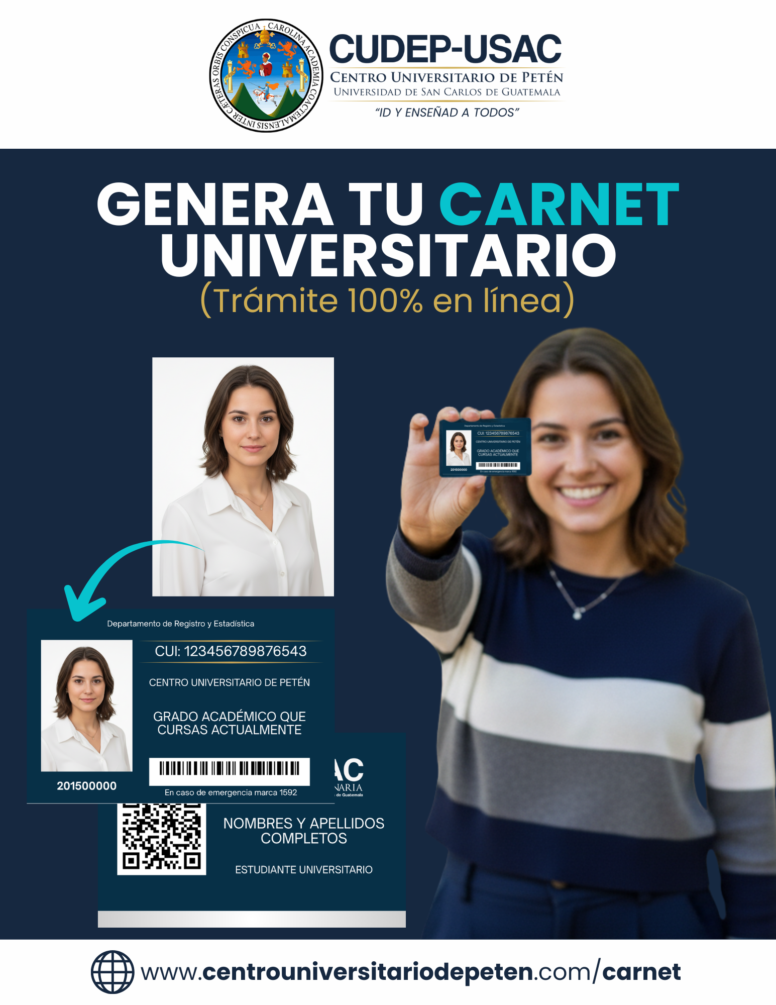 El Centro Universitario de Petén informa a toda la Comunidad Sancarlista que de ahora en adelante el trámite de Carnet Universitario se puede gestionar totalmente en línea siguiendo las instrucciones que encontrarán en nuestro sitio web oficial: