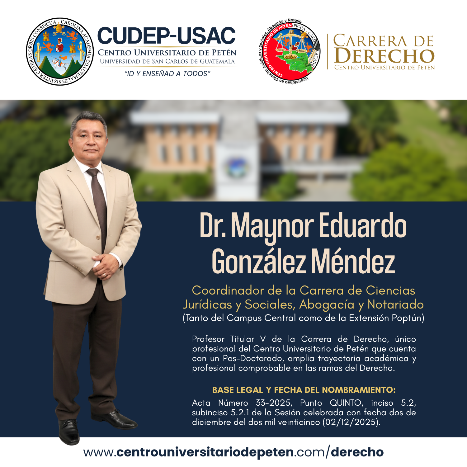 Dr. Maynor Eduardo González Méndez es un reconocido profesional guatemalteco del Derecho, con una destacada trayectoria académica, docente y jurídica a nivel nacional. El 02 de diciembre de 2025 fue nombrado por el Consejo Directivo del Centro Universitario de Petén como Coordinador de la Carrera de Ciencias Jurídicas, Abogacía y Notariado, cargo del cual tomó posesión oficialmente en enero de 2026, asumiendo la responsabilidad de fortalecer la formación jurídica universitaria en la región.
